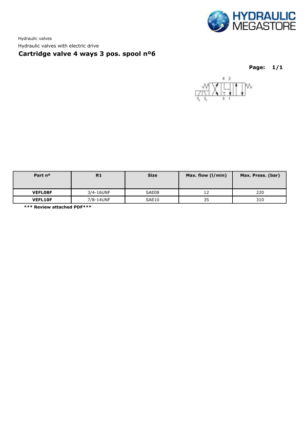 | VEFL10F | 7/8-14 UNF Cartridge Valve 4 Ways 3 Pos. Spool No6 | £101.91Ex. VAT£122.29Incl. VAT | £101.91Ex. VAT£122.29Incl. VAT |
