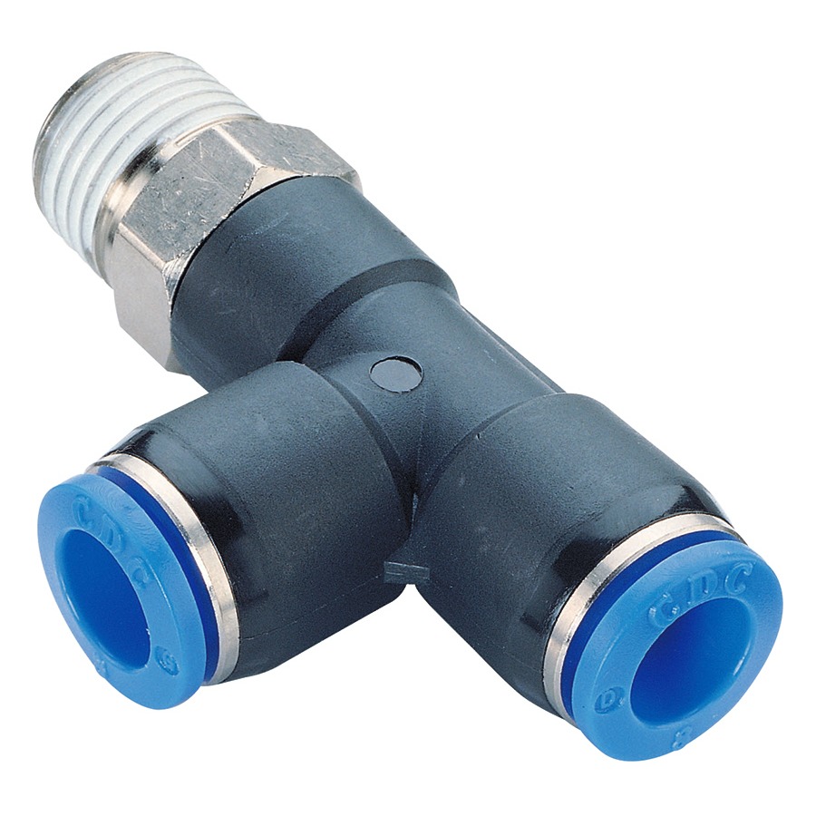 Homepage — Pneumatic Products — CDC Plastic Push-in Fittings — CDC Push-in Fittings - Metric — CDC Push-in Fittings - Tube to Thread — ONE-TOUCH PST BSPT - SWIVEL ROTATING MALE RUN TEE — 10mm OD X 1/2″ BSPT THREAD CDC ONE-TOUCH MALE RUN TEE