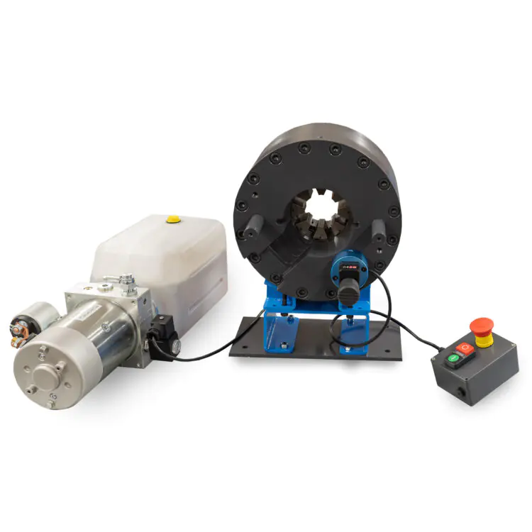 The OM-20-DC-M from OMNI-PRESS is the ideal option for the back of a mobile service van set up. Capable of swaging hoses from 3/16″ to 1-1/4″ (4 wire) and 1-1/2″ (2 wire) it gives a huge coverage range from a mobile hose replacement perspective. The machine itself is only 96kg, this is one of our lightest machines and keeps the weight of the vehicle as low as possible, giving more allowance for hose and fitting stock. As this machine has aa modular design, it helps to keep the weight off the racking and lower in the vehicle by mounting the powerpack to the floor.