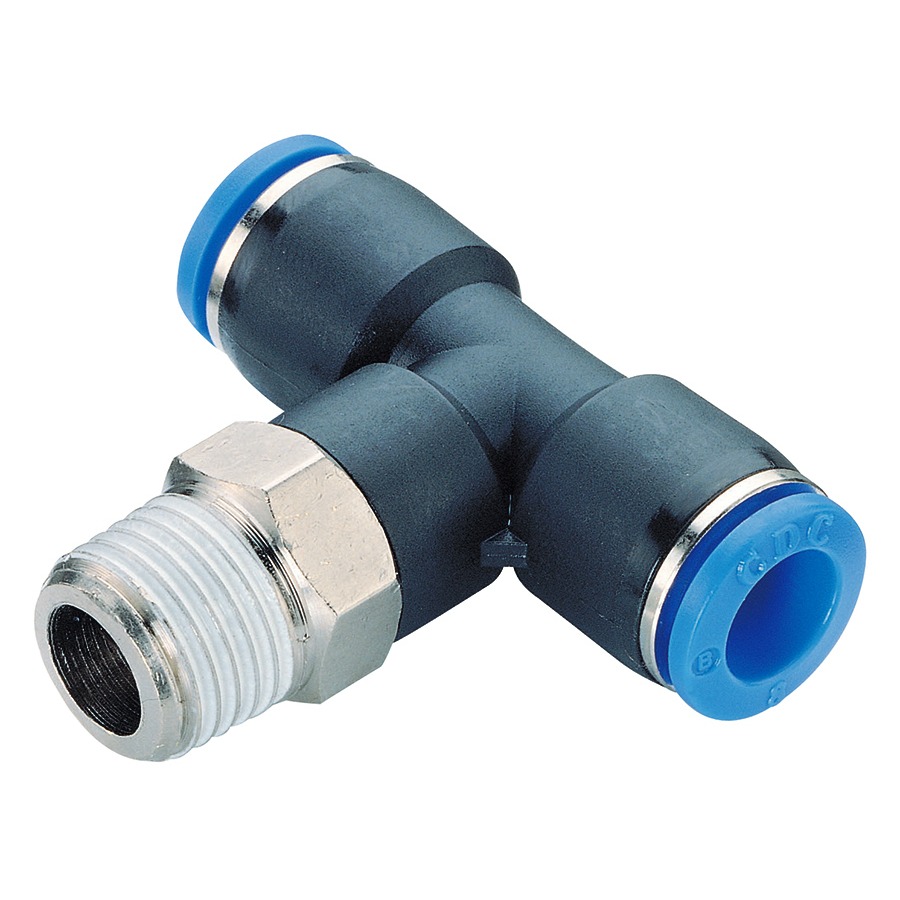 Homepage — Pneumatic Products — CDC Plastic Push-in Fittings — CDC Push-in Fittings - Metric — CDC Push-in Fittings - Tube to Thread — ONE-TOUCH PT BSPT - SWIVEL ROTATING MALE BRANCH TEE — 8mm OD X 1/8″ BSPT THREAD CDC ONE-TOUCH MALE BRANCH TEE