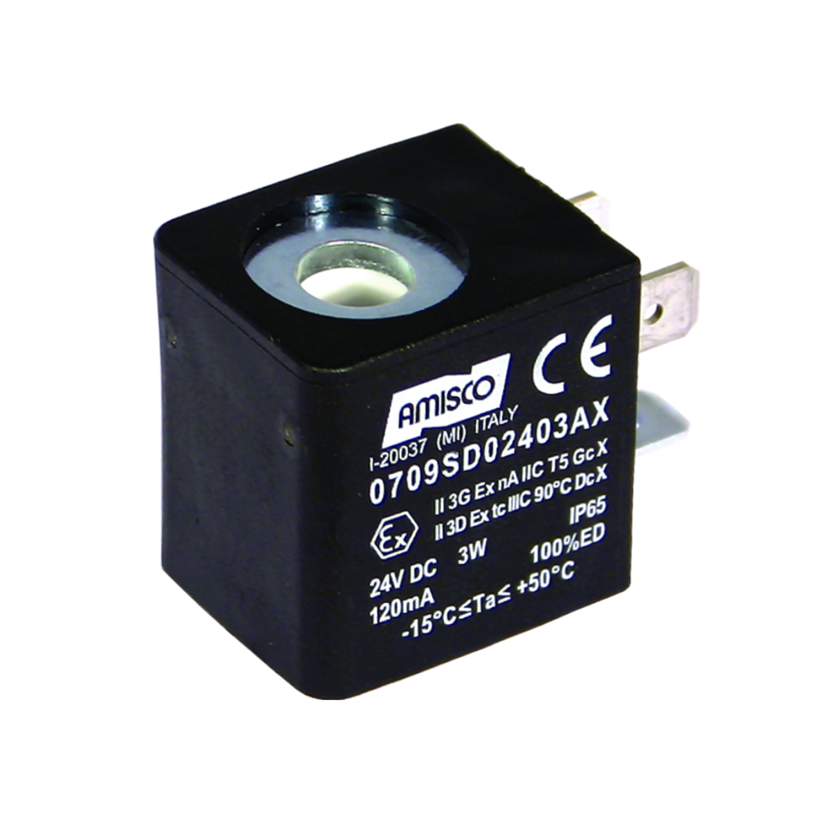 Series of coils conforming to 2014/34/EU directive for application in potentially explosive atmospheres Group II, Category 3, Gas & Dust. Isolation Class F.