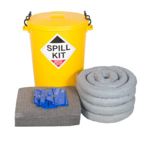 The kit includes absorbent socks to contain spills and protect drains and absorbent pads to soak up spilled liquids. Disposal bag and zip-tie included.