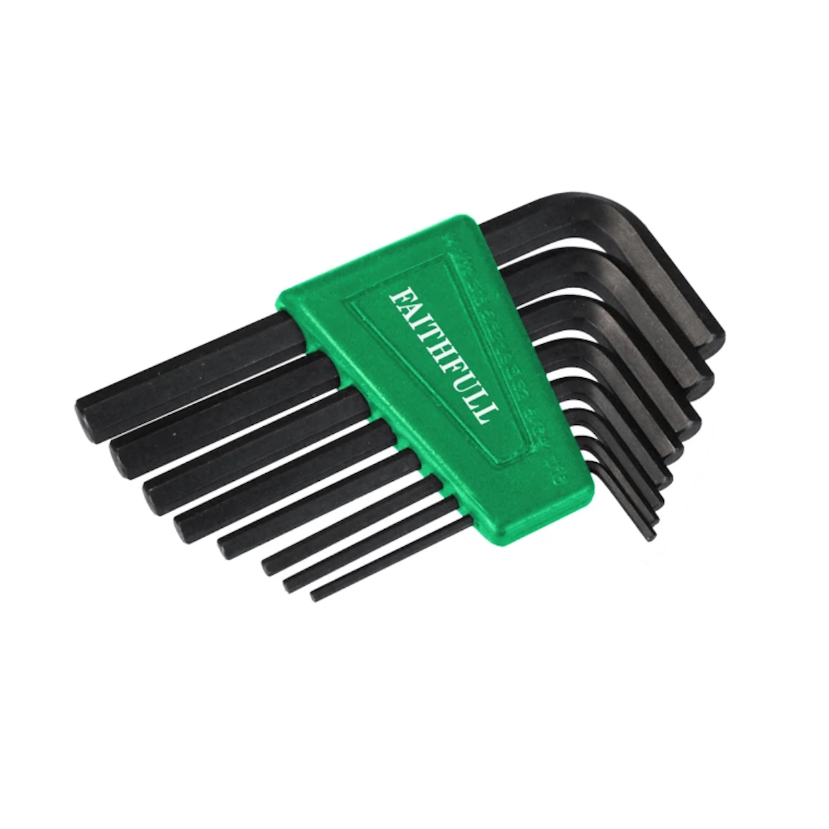 This Faithfull Short Arm Hex Key Set contains a selection of professional quality keys made from fully hardened Chrome-Vanadium steel. All keys from 4mm have chamfered edges to prevent damage to blade and fittings.