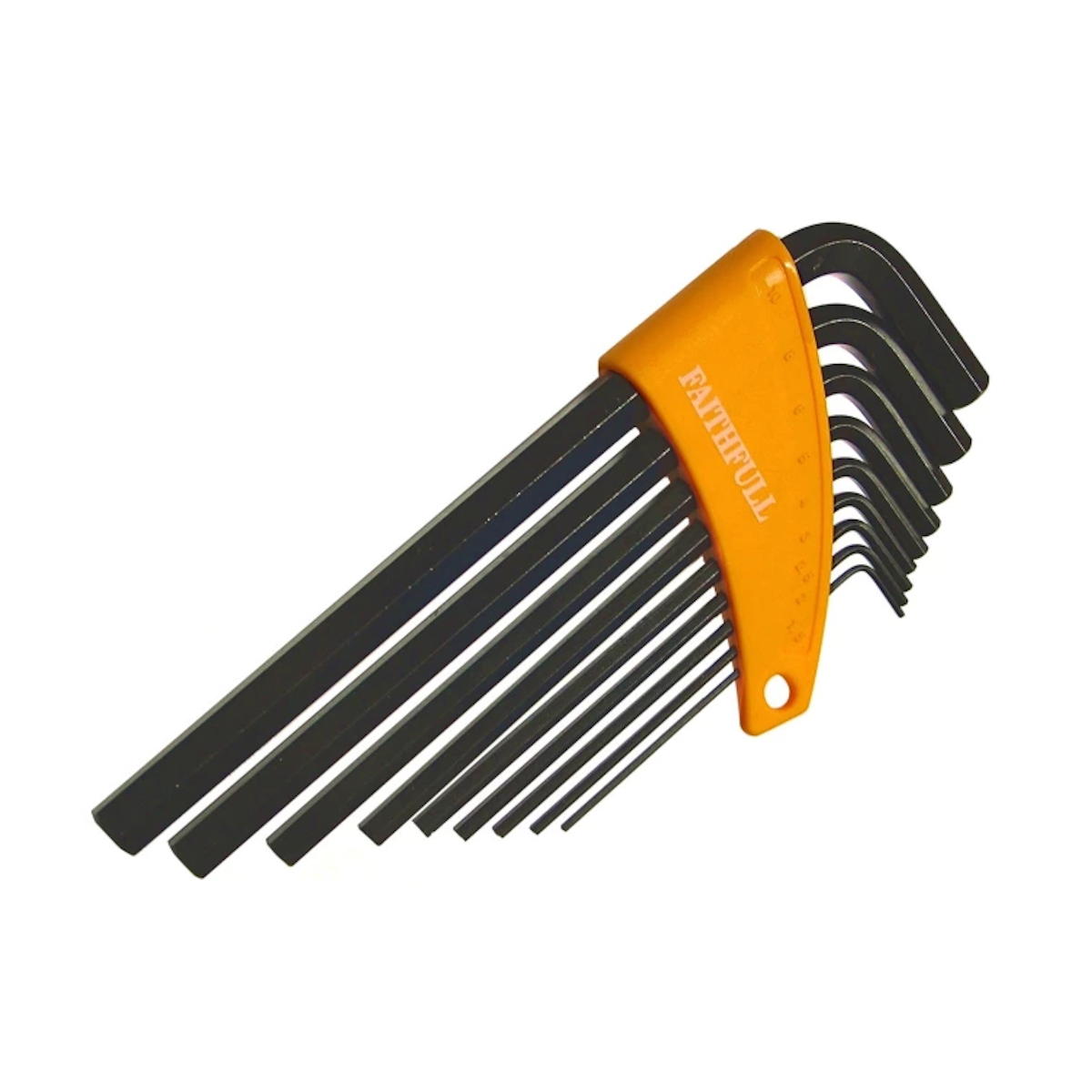 This Faithfull Long Arm Hex Key Set contains a selection of professional quality keys made from fully hardened Chrome-Vanadium steel. All keys from 4mm have chamfered edges to prevent damage to blade and fittings. Long arm design allows access to deep set screws or difficult to reach places.