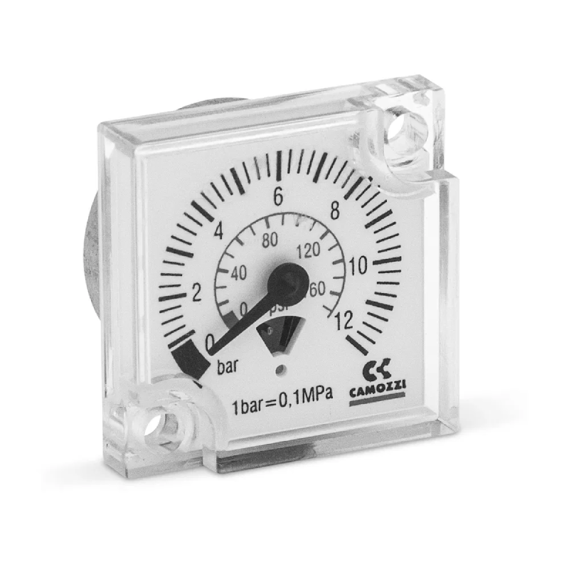 Engineered to Camozzi’s high manufacturing standards, the built-in pressure gauge offers exceptional accuracy, durability, and ease of use. Its integrated design reduces space requirements and protects the gauge from accidental impact, while the clear dial display allows for easy, precise monitoring of air pressure within the system.