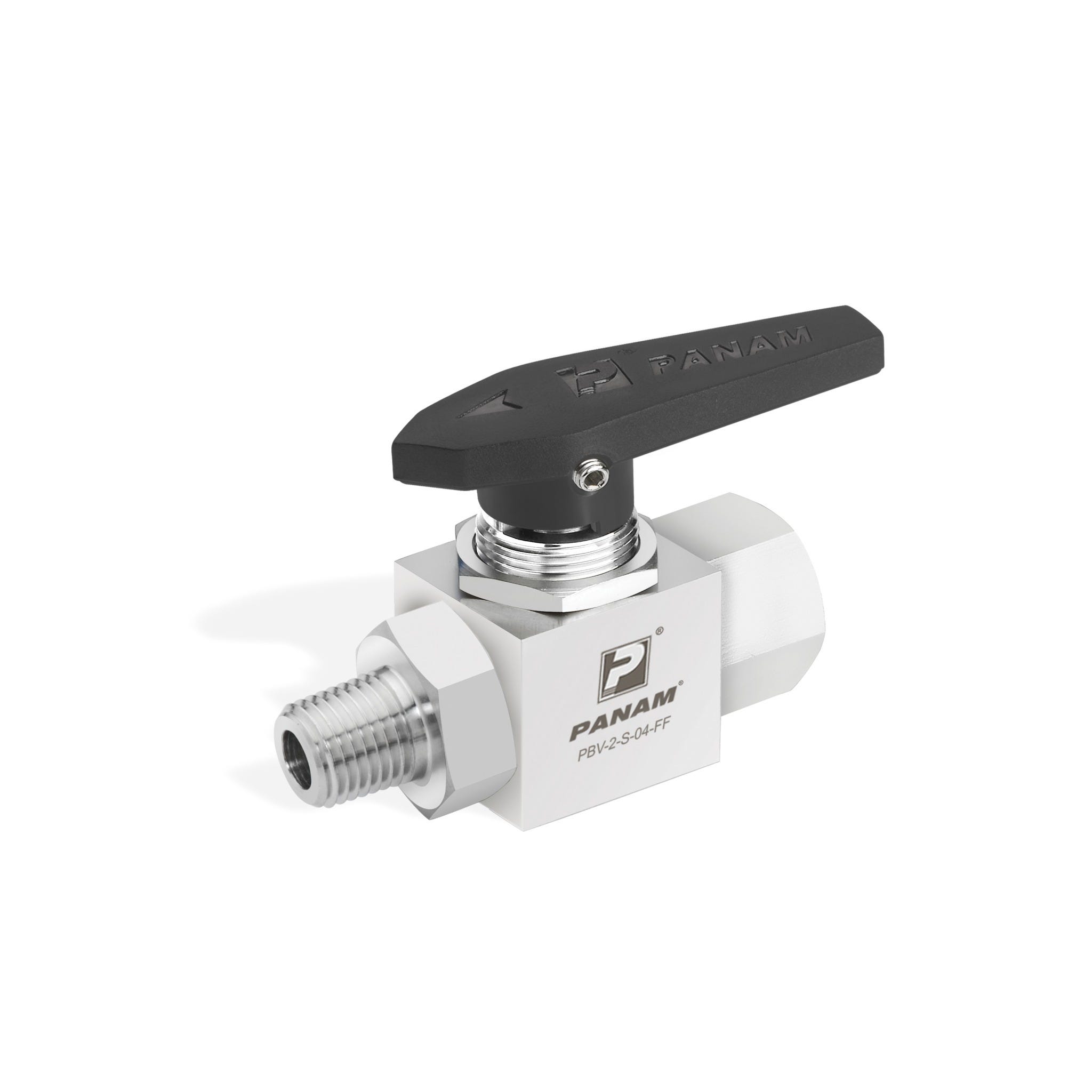 Panam 2-Way Ball Valve 300 Series, Stainless Steel 316 SS, 1/8", BSPT, Male / Female, Delrin, Black, Straight PRODUCT CODE - PBV-2-S-02R-MF