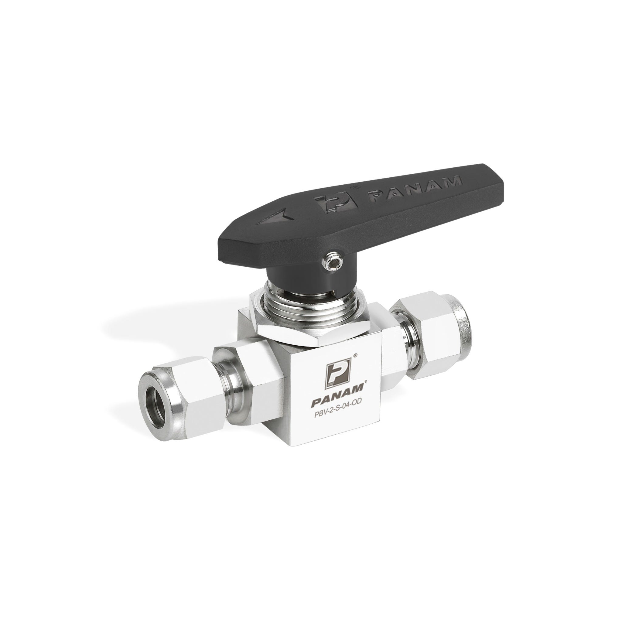 Panam 2-Way Ball Valve 300 Series, Stainless Steel 316 SS, 8MM, PANAM® Tube Fittings, Delrin, Black, Straight PRODUCT CODE - PBV-2-S-M08-OD