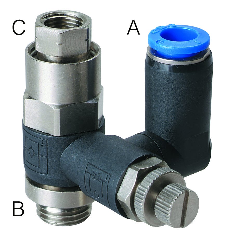 PVSC-G – Swivel Rotating with Pilot Check Valve speed controllers are high-precision pneumatic fittings designed to regulate airflow and control cylinder speed while incorporating a pilot-operated check valve for secure load holding. Rated for demanding industrial applications, they ensure smooth actuator movement and enhanced operational safety.